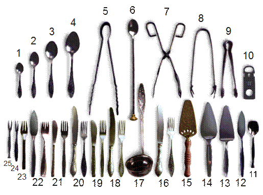 Столовые приборы разделяются на приборы для раскладывания и приёма пищи. Основные столовые приборы можно увидеть на рисунке 4.8.
