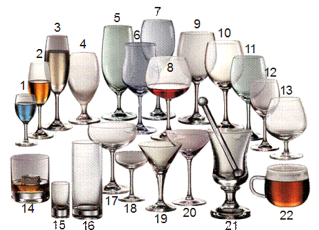 13 – фужер для минеральной воды; 14 – рейнвейная рюмка (для белого вина); 15 – лафитная рюмка (для красного вина); 16 – бокал для шампанского