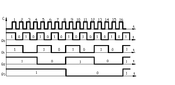 Рис. 11.25. Временные диаграммы работы двухтактного двоичного счётчика по модулю 16