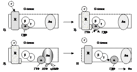 G-белки регулируют активность аденилатциклазы, фосфолипазы С, фосфодиэстеразы, Na+- и K+-каналов. G-белки олигомеры, состоят из 3 субъединиц α, β, γ. Есть активаторные Gs-белки, они активируют мембранные ферменты, есть ингибиторные Gi-белки, они ингибируют мембранные ферменты.