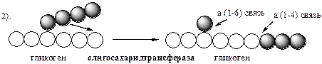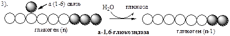 Гликогенфосфорилаза расщепляет фосфоролизом α-1,4-гликозидные связи, до тех пор, пока до точки ветвления не остается 4 остатка глюкозы.