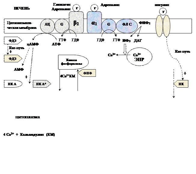 В печени существует и аллостерическая регуляция гликогенфосфорилазы: ее ингибирует АТФ и глюкозо-6ф, а активирует АМФ.
