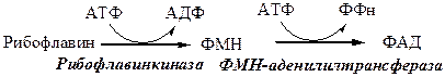 Активация.Вслизистой оболочке кишечника после всасывания витамина происходит образование коферментов ФМН и ФАД по схеме:
