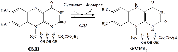 Биологические функции.Коферменты ФАД и ФМН входят в состав аэробных и анаэробных дегидрогеназ, принимающих участие в окислительно-восстановительных реакциях (реакции окислительного фосфорилирования, СДГ, оксидазы АК, ксантионоксидаза, альдегидоксидаза и т.д.).