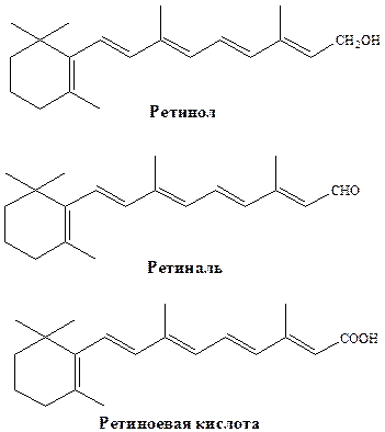 Структура.Витамин А представлен 3 веществами: ретинолом (циклический, ненасыщенный, одноатомный спирт), ретиналем и ретиноевой кислотой.