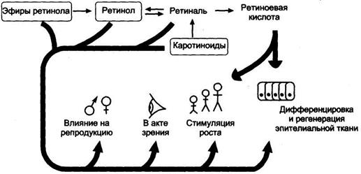 Ретинол и ретиналь участвуют в зрительном процессе. Светочувствительный аппарат глаза — сетчатка. В сетчатке происходит преобразование энергии света в химическую энергию, которая приводит к появлению нервного импульса. У человека сетчатка содержит 2 типа рецепторных клеток: палочки и колбочки. Палочки реагируют на слабое (сумеречное) освещение, а колбочки — на хорошее освещение (дневное зрение). Палочки содержат зрительный пигмент родопсин, а колбочки — йодопсин. Оба пигмента — сложные белки, отличающиеся своей белковой частью, в качестве кофермента они содержат ретиналь.