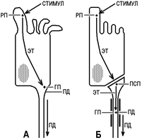 Рис. . Проведение сенсорной информации в первичных (А) и вторичных (Б) рецепторах. РП - рецепторный потенциал, ЭТ- электротоническое распространение потенциала, ПСП – постсинаптический потенциал, ГП – генераторный потенциал, ПД – потенциал действия.