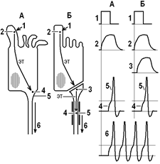 Рис. . Возникновение электрических потенциалов в первичных (А) и вторичных (Б) рецепторах. 1 – стимул (раздражитель), 2 - рецепторный потенциал, 3 – постсинаптический потенциал, 4 – генераторный потенциал, 5 – потенциал действия, 6 – серия потенциалов действия.