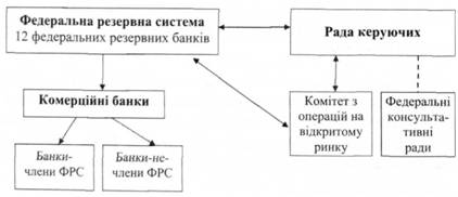 ФРС складається з трьох рівнів і включає в себе Раду керуючих, 12 федеральних резервних банків із 49-ма філіями, приблизно 3 000 банків-членів ФРС та банки-нечлени ФРС, які поділяються на ті, що входять у Федеральну корпорацію страхування депозитів (далі - ФКСД), та ті, чиї внески не застраховані у ФКСД. Схематично ФРС можна представити у вигляді схеми (рис. 3.1). Також до складу ФРС відносять Федеральний комітет з операцій на відкритому ринку (ФКОВР) та федеральні консультативні ради (ФКР).