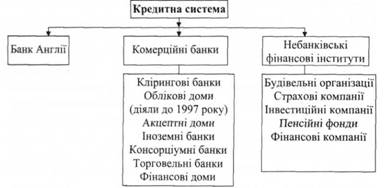 Сьогодні усі кредитні установи Великобританії можна поділити на дві групи: банківський сектор та небанківські фінансові інститути (рис. 4.1). Згідно з банківським законодавством в основі банківської системи є Банк Англії.