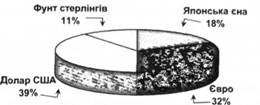 Відповідаючи за безперебійну роботу світової валютної й платіжної системи, Фонд приділяє особливу увагу стану ліквідності у світовому масштабі, тобто рівню і складу резервів, що є у держав-членів, та призначених для покриття торгових і платіжних потреб. Однією з важливих функцій Фонду є надання додаткових ліквідних засобів своїм членам за рахунок розподілу спеціальних прав запозичення (СДР). СДР (або СПЗ - спеціальні права запозичення) - міжнародна розрахункова валютна одиниця, яка використовується як умовний масштаб для порівняння міжнародних вимог і зобов'язань, встановлення валютного паритету й курсу, як міжнародний платіжний та резервний засіб. Вартість СДР визначається на основі середньої вартості чотирьох основних валют світу (до 1 січня 1981 р. - шістнадцяти валют). Визначення питомої ваги кожної валюти проводиться з урахуванням частки країни в міжнародній торгівлі, але для долара США береться до уваги його питома вага в міжнародних розрахунках (рис. 19.2). На сьогодні емітовано 21,4 млрд СДР з сукупною вартістю близько 29 млрд доларів США, що становить близько 2 % усіх резервів.