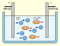 Достигнув катода, ионы меди нейтрализуются избыточными электронами катода и превращаются в нейтральные атомы, оседающие на катоде. Ионы хлора, достигнув анода, отдают по одному электрону. После этого нейтральные атомы хлора соединяются попарно и образуют молекулы хлора