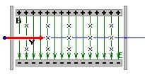 На частицу в скрещенных полях действует электрическая сила Кулона и магнитная сила Лоренца. Когда эти силы равны по величине и противоположны по направлению, заряженная частица будет двигаться внутри конденсатора равномерно и прямолинейно рис. 13.16.