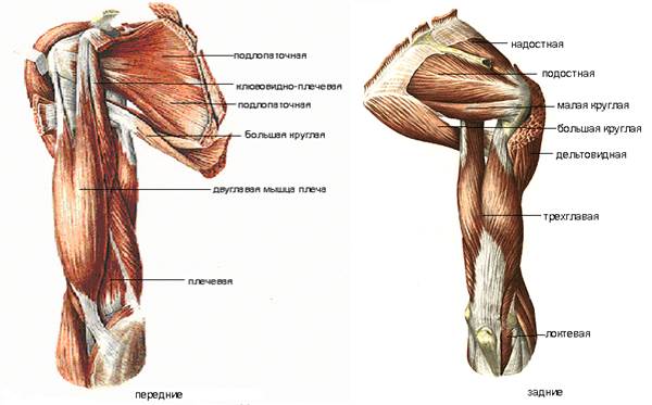 | Дельтовидная | ключица, акромион и ость лопатки | дельтовидная бугристость плечевой кости | отведение руки, передние пучки тянут руку вперед, задние – назад |