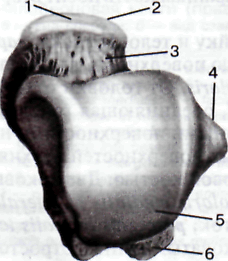 а: 1 – fovea capitis ossis femoris; 2 – collum ossis femoris; 3 – linea intertrochanterica; 4 – epicondylus medialis; 5 – facies patellaris; 6 – epicondylus lateralis; б: 1 – caput ossis femoris; 2 – trochanter major; 3 – fossa trochanlerica; 4 – crista intertrochanterica; 5 – tuberositas glutea; 6 – linea aspera; 7 – labium mediale; 8 – labium laterale; 9 – facies poplitea; 10 – condylus lateralis; 11 – fossa intercondylaris; 12 – condylus medialis; 13 – epicondylus medialis; 14 – trochanter minor; в: 1 – basis patellae; 2 – apex patellae.