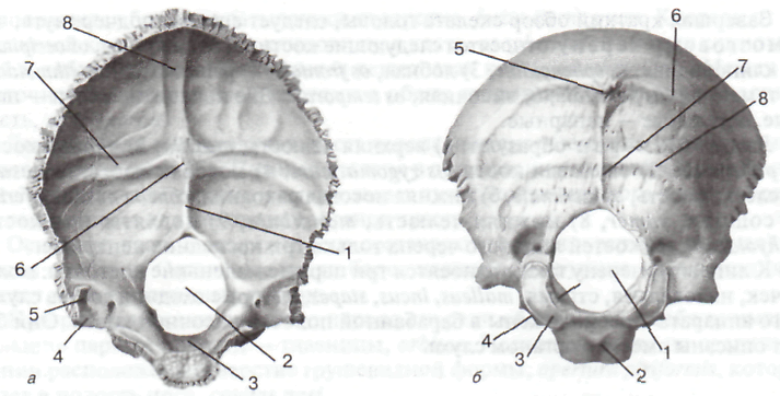 a: 1 – crista occipitalis interna; 2 – foramen magnum; 3 – clivus; 4 – incisura jugularis; 5 – sulcus sinus sigmoidei; 6 – protuberantia occipitalis interna; 7 – sulcus sinus transversi; 8 – sulcus sinus sagittatis superioris; б: 1 – foramen magnum; 2 – tuberculum pharyngeum; 3 – condylus occipitalis; 4 – canalis hypoglossalis; 5 – protuberantia occipitalis externa; 6 – linea nuchae superior; 7 – crista occipitalis externa; 8 – linea nuchae inferior.