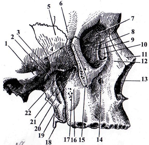 1 – arcus zygomaticus ( перепилина ); 2 – fossa infratemporalis; 3 – crista infratemporalis; 4 – fossa temporalis; 5 – ala major ossis sphenoidalis; 6 – processus zygomaticus ossis frontalis; 7 – pars orbitalis ossis frontalis; 8 – labyrinthus ethmoidalis; 9 – os lacrimale; 10 – sulcus nasolacrimalis; 11 – os nasale; 12 – processus frontalis maxillae; 13 – apertura piriformis; 14 – for. infraorbitale; 15 – os zygomaticum; 16 – tuber maxillae; 17 – foramina palatina minora; 18 – hamulus pterygoideus; 19 – processus pterygoideus; 20 – fissura orbitalis inferior; 21 – lamina perpendicularis ossis palatini; 22 – for. sphenopalatinum.