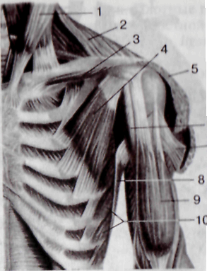 | Рис. 5.8. Мышцы груди, плечевого пояса и плеча (вид спереди). 1 — m. sternocleidomastoideus; 2 — m. trapezius; 3 — sulcus deltoideopectoralis;4 — m. deltoideus; 5 — m. pectoralis major (pars clavicularis); 6 — m. pectoralis major (pars sternocostalis); 7 — m. pectoralis major (pars abdominalis); 8 — m. biceps brachii;9 — cavitas axillaris; 10 — m. latissimus dorsi; 11 — m. serratus anterior | Рис. 5.9. Мышцы груди и плеча (вид спереди; большая грудная и дельтовидная мышцы (частично) удалены). 1 — m. sternocleidomastoideus; 2 — m. trapezius; 3 — m. subclavius; 4 — m. pectoralis minor; 5 — m. deltoideus; 6 — m. coracobrachialis; 7 — m. pectoralis major; 8 — m. lattisimus dorsi; 9 — m. biceps brachii; 10 — m. serratus anterior |