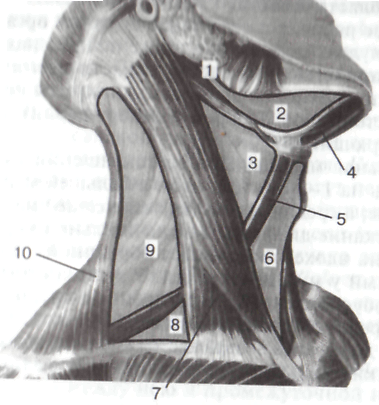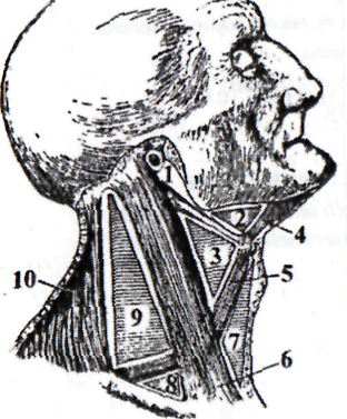 | Рис. 5.19. А. Схема треугольников шеи. 1 — fossa retromandibularis; 2 — trigonum submandibulare; 3 — trigonum omohyoideum;4 — m. digastricus (venter anterior); 5 — m. omohyoideus (venter superior); 6 — trigonum omotracheale; 7 — m. sternocleidomastoideus; 8 — trigonum omoclaviculare; 9 — trigonum omotrapezoideum; 10 — m. trapezius. | Рис. 5.19. Б. Схема треугольников шеи. 1 - fossa retromandibularis; 2 - trigonum submandibulare; 3 -trigonum omohyoideum (carotieum); 4 - m. digastricus; 5 - m. omohyoideus; 6 - m. slernocleidomasloidcus; 7 -trigonum nmotracheale: 8 -trigonum omoclaviculare; 9 - trigonum omotrapezoideum; 10 - m. trapezius. |