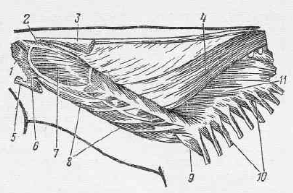 Межреберные наружные мышцы — m.m. intercostales externi (рис.15—11) — расположены между соседними ребрами, закрепляясь на них и образуя мягкую стенку грудной клетки. Это прямые продолжатели подидмателей ребер на нижележащих частях боковых стенок грудной клетки. В функции данных мышц особое значение имеет действие лестничной мышцы (7), фиксирующей первые ребра.