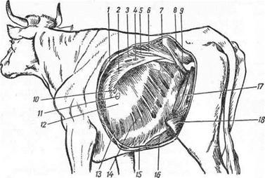 Подниматели ребер — m.m. levatores costarum (рис. 16 — 10) — лежат под длиннейшей и подвздошно-реберной мышцами. Начинаются они от сосцевидных отростков грудных позвонков, оканчиваются на вертебральных концах позади лежащих ребер. Более развитые из них располагаются в средней, очень подвижной части грудной клетки, а первый и последний — рудименты.