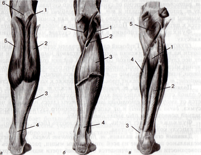 а: 1 — m. plantaris; 2 — caput laterale т. gastrocnemii; 3 — m. soleus; 4 — tendo calcaneus; 5 — caput mediate m. gastrocnemii; 6 — fossa poplitea; б: 1 — m. plantaris; 2 — canatis cruropopliteus (верхнее отверстие); 3 — m. soleus; 4 — tendo calcaneus; 5 — m. popliteus; в: 1 — m. tibialis posterior; 2 — m. flexor hallucis longus; 3 — retinaculum musculorum flexorum; 4 — m. flexor digitorum longus; 5 — m. popliteus