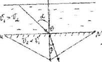 Нехай швидкість світла в першому середовищі дорівнює VI у другому - V2, МN - межа розділу двох середовищ. Якщо V1>V2, то перше середовище менш щільне стосовно іншого. Кут α між перпендикуляром, поставленим у точку падіння променя на межі розділу двох середовищ (точка о) і «променя, що падає» називається кутом падіння.