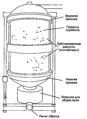 Б. Адсорберы углекислого газа.Гранулами сорбента заполняют один или два контейнера, плотно пригнанные между верхней и нижней крышками. Вся эта конструкция называется адсорбером(рис. 3-7). Двойные контейнеры, единственным недостатком которых является некоторая громоздкость, обеспечивают более полную адсорбцию углекислого газа, менее частую замену сорбента и меньшее сопротивление газовому потоку.