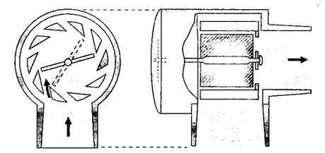 Спирометр Райта(Wright), расположенный в экспираторном колене дыхательного шланга перед клапаном выдоха, измеряет выдыхаемый дыхательный объем (рис. 4-6). Поток газа внутри респирометра приводит во вращательное движение крыльчатки или роторы; степень ротации измеряется электронным, фотоэлектрическим или механическим способом. В современных наркозных аппаратах для измерения минутного объема дыхания и дыхательного объема применяют именно этот принцип. Выдыхаемый дыхательный объем зависит от параметров ИВЛ (установленных анестезиологом), но также изменяется при утечках, разгерметизации или неисправностях в работе респиратора. Спирометр Райта может давать ошибочные значения под воздействием инерции, силы трения и конденсации водяных паров. Кроме того, в измеряемый выдыхаемый дыхательный объем входит объем, "потерянный" в дыхательном контуре за счет сжатия газа и расширения дыхательных шлангов. Длинные шланги с высокой растяжимостью, большая частота дыхания и высокое давление в дыхательных путях — все это значительно увеличивает разницу между объемом смеси, подаваемым в дыхательный контур, и объемом, поступающим в дыхательные пути больного.
