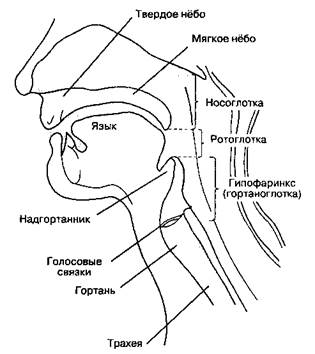 Успешное проведение масочной вентиляции, интубации трахеи, коникотомии и регионарной анестезии гортани зависит от детального знания анатомии дыхательных путей. У человека существует два отверстия для входа воздуха: нос, полость которого сообщается с носоглоткой,и рот, переходящий в ротоглотку.В переднем отделе эти полости разделены нёбом, но в задних отделах сливаются (рис. 5-1). В основании языка расположен надгортанник,функция которого состоит в отделении гортани от гипофаринкса (гортаноглотки);гортань переходит в трахею,а гипофаринкс — в пищевод. В процессе акта глотания надгортанник, предотвращая аспирацию, прикрывает голосовую щель,которая является входом в гортань. Гортань состоит из комплекса хрящей, которые скрепляются между собой связками и мышцами. В состав гортани входит девять хрящей (рис. 5-2): непарные щитовидный, перстневидный, надгортанныйи парные черпаловидные, рожковидные и клиновидные.