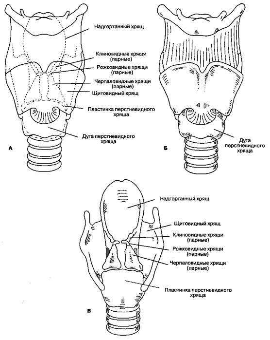 Рис. 5-2.Хрящи гортани. А. Девять хрящей гортани: взаиморасположение. Б. Вид спереди. В. Вид сзади. (Из: Hol-linshead W. H. Textbook of Anatomy, 4th ed. Harper & Row, 1985. Воспроизведено с изменениями, с разрешения.)