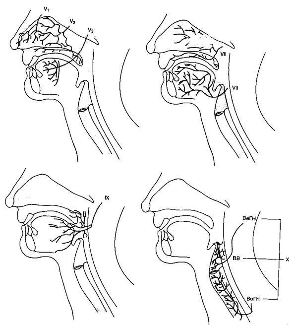 V1 Глазной нерв — первая ветвь тройничного нерва (передний решетчатый нерв) V2 Верхнечелюстной нерв — вторая ветвь тройничного нерва (крыловиднонёбные нервы) V3 Нижнечелюстной нерв — третья ветвь тройничного нерва (язычный нерв)