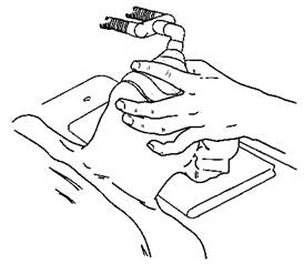 Если маска удерживается левой кистью, правой рукой можно осуществлять вентиляцию, сдавливая дыхательный мешок. Маску прижимают к лицу, надавливая вниз на ее корпус большим и указательным пальцами левой руки (рис. 5-8). Средний и безымянный пальцы охватывают нижнюю челюсть, разгибая голову в атлантозатылочном сочленении. Давление пальцев должно распространяться на кость нижней челюсти, но не на мягкие ткани, лежащие в основании языка,— последнее может вызвать обструкцию дыхательных путей. Мизинец расположен под углом нижней челюсти и выдвигает челюсть вперед.