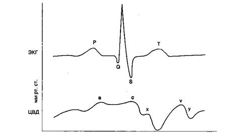 Рис. 6-19.Направленные вверх (а, с, v) и вниз (х, у) волны кривой центрального венозного давления, соотнесенные с ЭКГ. (Из: Gravenstein J. S., Paulus D. A. Monitoring Practice in Clinical Anesthesia. Lippincott, 1982. Воспроизведено с разрешения.)