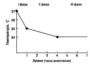 Рис. 6-33.Характерная температурная кривая при непреднамеренной гипотермии во время общей анестезии: резкое снижение температуры в течение первого часа (I фаза — перераспределение), последующее постепенное снижение в течение 3-4 ч (II фаза — потери тепла) и, наконец, стабилизация температуры (III фаза — равновесие)