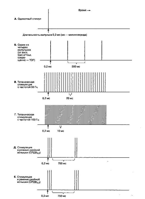 Тетаническая стимуляция.Непрерывная серия импульсов частотой 50-100 Гц, подаваемых в течение 5 с, является чувствительным индикатором нервно-мышечной проводимости. Непрерывное сокращение в течение 5 с указывает на адекватное — но не обязательно полное — прекращение действия миорелаксантов. Стимуляция в режиме двойной вспышки (СРДВ)более комфортна для больного, чем тетаническая стимуляция. СРДВ имеет два варианта: серия из трех коротких (0,2 mc) импульсов с интервалом 20 mc (частота 50 Гц), затем пауза длиной 750 mc, после чего повторяются два (СРДВ3,2) или три (СРДВ3,3) импульса, аналогичных начальным. Стимуляция в режиме двойной вспышки более чувствительна для клинической (визуальной) оценки затухания, чем стимуляция в TOF-режиме.
