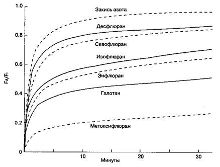 Рис. 7-2.fa быстрее достигает Fi при использовании закиси азота (анестетик с низкой растворимостью в крови), чем метоксифлюрана (анестетик с высокой растворимостью в крови). Объяснения обозначений fa и Fi даны в рис. 7-1. (Из: Eger E. L. II. Isoflurane [Forane]: A reference and compendium. Ohio Medical Producta, 1981. Воспроизведено с изменениями, с разрешения.)