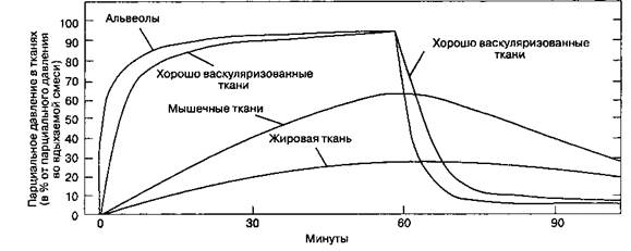 Рис. 7-3.Подъем и снижение альвеолярного парциального давления предшествуют аналогичным изменениям парциального давления в других тканях. (Из: Cowles A. L. et al. Uptake and distribution of inhalation anesthetic agents in clinical practice. Anesth. Analg., 1968; 4: 404. Воспроизведено с изменениями, с разрешения.)