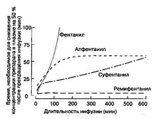 Рис. 8-7. В отличие от других опиоидов после прекращения инфузии ремифентанила его концентрация в плазме очень быстро снижается на 50 %. Кроме того, время, в течение которого концентрация снижается вдвое, не зависит от длительности инфузии ремифентанила. (Из: Egan T. D. The pharmacokinetics of the new short-acting opioid remifen-tanil [GI87084B] in healthy adult male volunteers. Anesthe-siology, 1993; 79:881. Воспроизведено с разрешения.)