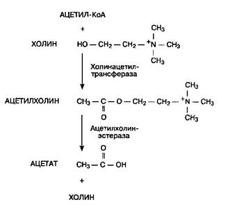 Рис. 10-1.Синтез и и гидролиз ацетилхолина