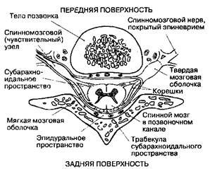 Рнс. 16-5.Позвонок, спинной мозг с оболочками, спинномозговые нервы: поперечный срез. (Из: Waxman S, G., deGroot J. Correlative Neuroanatomy, 22nd ed. Appieton & Langc, 1995. Воспроизведено с изменениями, с разрешения.)