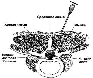 Рис. 16-13.Спинномозговая анестезия на поясничном уровне: Парамедианный (околосрединный) доступ