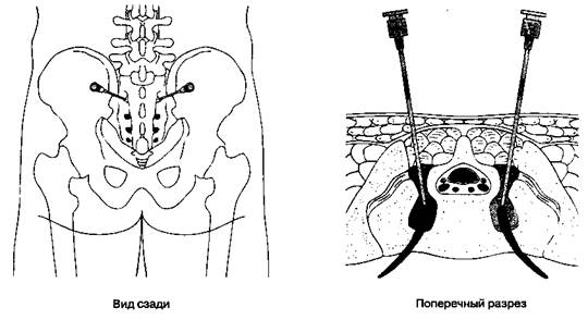 дят 5-10 мл раствора анестетика подкожно сразу позади от седалищной ости, в месте прикрепления крестцово-остистой связки. Седалищную ость пальпируют через прямую кишку или влагалище. При блокаде из чрезвлагалищного доступа используют специальное приспособление (см. гл. 43).