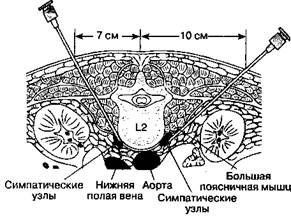 Г. Осложнения.Осложнения включают непреднамеренную инъекцию в сосуд (в нижнюю полую вену, аорту, поясничные сосуды) и блокаду соматических нервов поясничного сплетения.