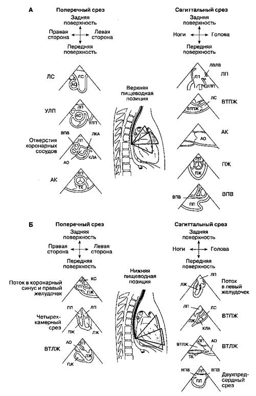 Рис. 21-2.Информативные срезы при чреспищеводной эхокардиографии в верхней пищеводной (А), нижней пищеводной (Б) и трансгастральной позиции (В) датчика. Отметим, что в каждой из этих позиций могут быть получены различные срезы. Для получения поперечных срезов датчик наклоняют вперед (антефлексия) или назад (ретрофлексия), для получения сагиттальных срезов датчик поворачивают слева направо. Поперечные срезы в каждом из трех положений датчика приведены в том порядке, в котором датчик последовательно меняет свой наклон спереди назад; сагиттальные срезы приведены в порядке поворота датчика слева направо. (С разрешения. Из: Richardson S. G. et al. Biplane transesophageal echocardiography utilizing transverse and sagittal imaging planes. Echocardiography, 1991; 8: 293.)