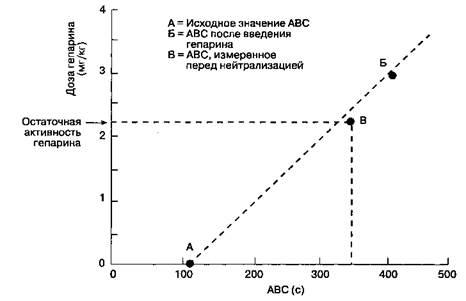 4. Если необходимо ввести дополнительную дозу антикоагулянта, находят желаемое значение ABC на этой линии. Дополнительная доза гепарина равна разнице между текущим значением ABC и желаемым ABC, спроецированной на ось у.