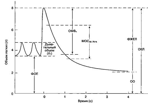 Рис. 22-10.Кривая форсированного выдоха у здорового человека. Скорость форсированного выдоха (COB25 ?5%), также называется максимальной скоростью потока в середине выдоха (МОС25-75%)