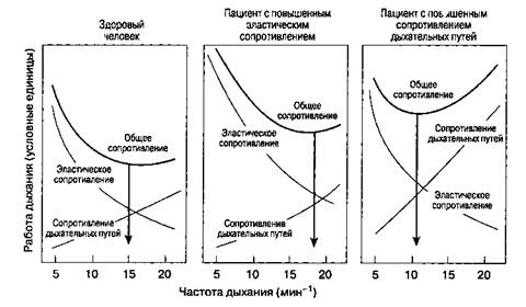 Рис. 22-12. Зависимость работы дыхания от частоты дыхания у здорового человека, у пациента с повышенным эластическим сопротивлением и у пациента с повышенным сопротивлением дыхательных путей. (С разрешения. Из: Nunn J. F. Applied Respiratory Physiology, 3rd ed. Butterworths, 1987.)