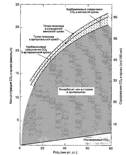 Рис. 22-24.Кривая диссоциации CO2 для цельной крови. (С разрешения. Из: Nunn J. F. Applied Respiratory Physiology, 3rd ed. Butterworths, 1987.)