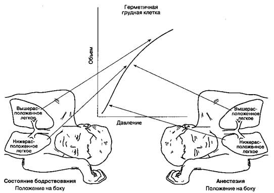 Рис. 24-1.Растяжимость легких в положении пациента на боку: состояние бодрствования